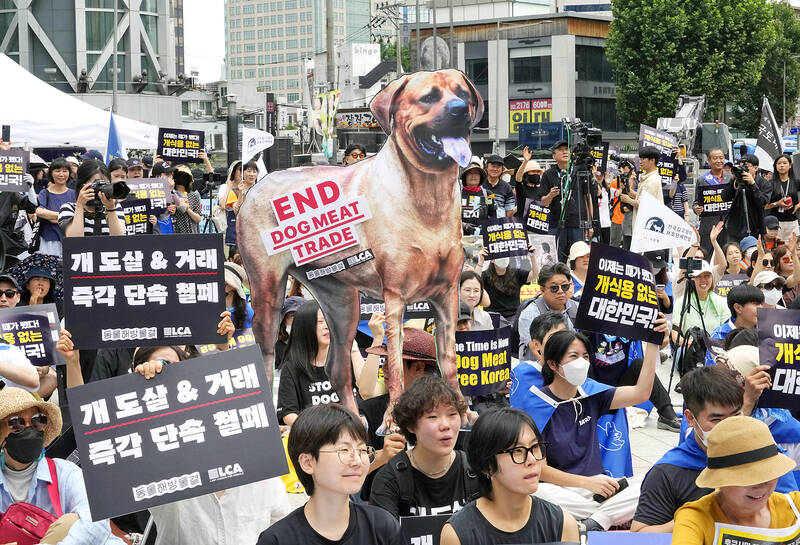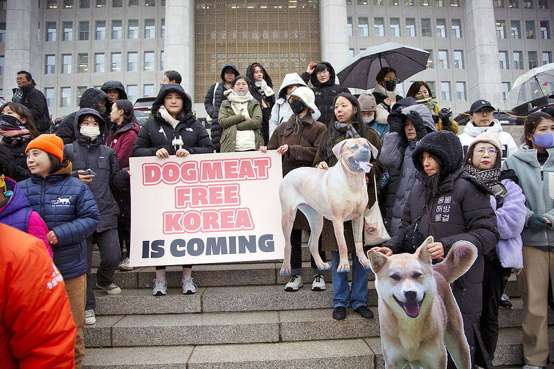 Dozens of animal rights activists gathered at the National Assembly to celebrate the bill’s passage. They carried large photos of dogs, chanted slogans and held placards reading “Dog meat-free Korea is coming.”
