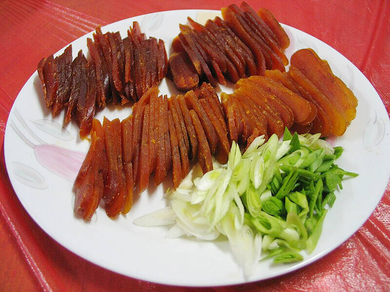 Mullet roe is a highly-priced delicacy typically served during special occasions like wedding banquets or Chinese New Year’s dinners, where families come together in celebration. The mullet roe can be prepared in various ways. It is usually pan-fried but can also be roasted or torched. To cook a pan-fried mullet roe, soak it in liquor or wine and peel off its membrane. Then, it is browned over a low fire and turned several times. Finally, the fried mullet roe is cut diagonally and is ready to be served. This dish is usually served with garlic scapes and daikon slices, but it’s especially tasty when paired with apple slices.
