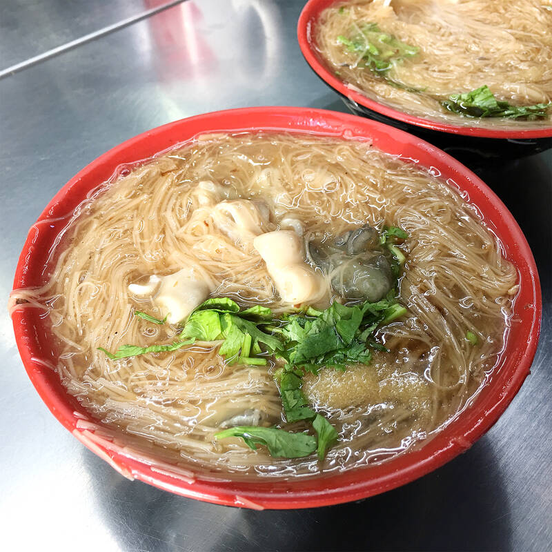 蚵仔麵線是台灣特有的小吃,一日三餐的好選擇。勾芡的羹湯中有蚵仔和紅麵線,湯裡可加蒜泥和芫荽(香菜)調味,喝起來口感滑順。除了經典的蚵仔麵線,也有大腸麵線,口感有嚼勁,不吃蚵仔與內臟也可以點清麵線。
