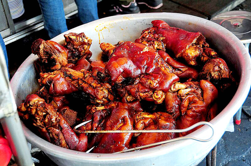 Roasted German trotter is a popular dish known for its crispy outer layer. In contrast, Taiwanese prefer to braise trotters, especially front trotters, as they are used more by a pig to walk and thus are leaner and have more tendons. This results in a gelatinous texture with a less greasy taste. After removing hair, quick-boiling, and cooling, they are marinated in a mixture of soy sauce, crystal sugar, and a spice pouch of Chinese herbs for a long period to achieve a bright amber appearance. The dish can be enjoyed hot or cold, and it is usually served with a dipping sauce that varies from restaurant to restaurant.