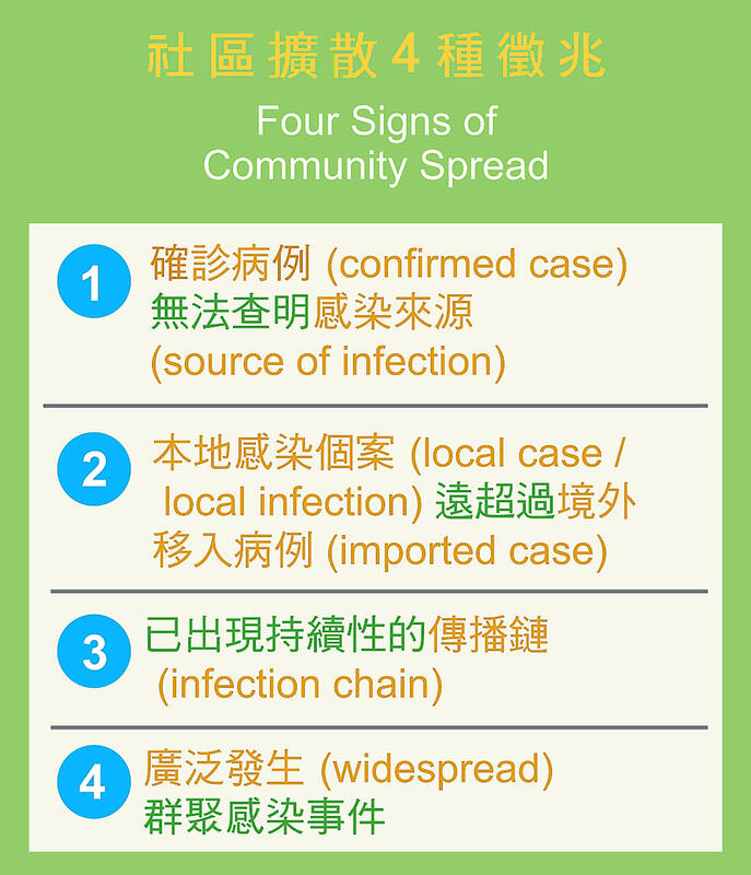 台灣第 19 例新冠肺炎確診病例是名「白牌車」(unlicensed taxi) 司機,陳時中部長特別說明這個病例可算是「*社區感染」,不是「社區傳播」。陳部長說明社區傳播的特性是:「在社區中走動都會被感染」。它具有四個徵兆: