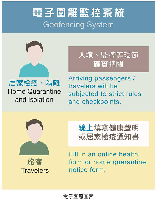 Taiwan has also set up an “electronic fence” system that makes use of mobile telephones to alert police and authorities if those in home quarantine step out of bounds.