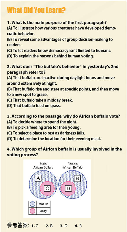 非洲水牛的投票系統很簡單。一頭水牛站起來、專注看著特定方向、重新躺下以開始這個程序。如果其他水牛同意這個選擇,牠們就會模仿這個行為。相反地,具有不同偏好的水牛會面對牠們想要的位置。最終,大多數水牛偏好的方向決定了牛群當晚的吃草地點。