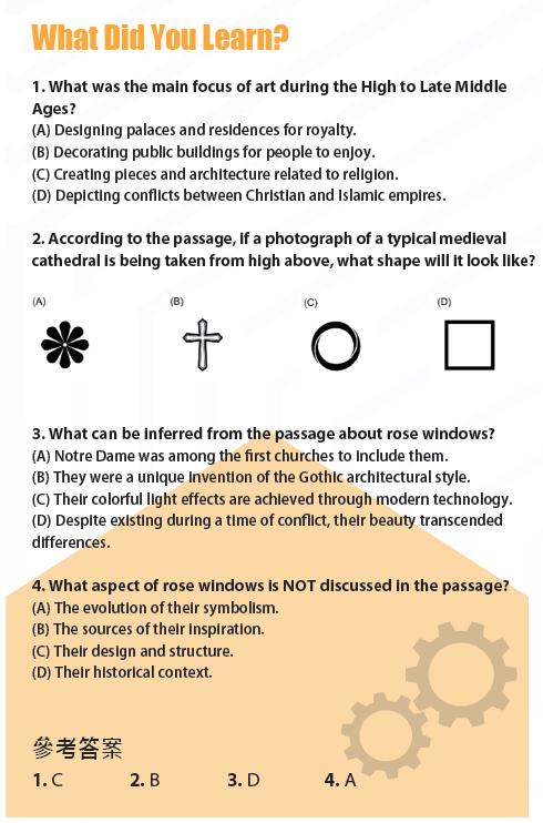 中世紀歐洲大教堂的平面配置圖通常是十字形的,而玫瑰窗經常被納入建築的正面和耳堂。巴黎聖母院有好幾個玫瑰窗,分別面向北、南和西邊,其中南面那扇窗最為著名,其直徑達十三公尺。這些窗戶在白天都被自然光照亮,將彩色的光線投射到該座堂的牆壁和地板上。