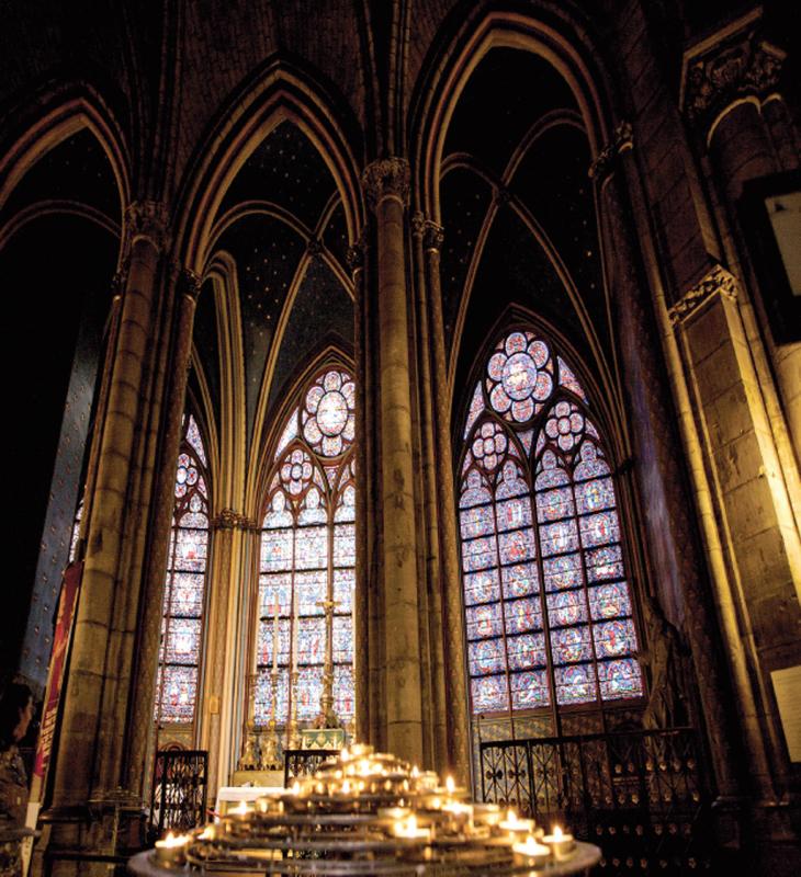 The ground plan of Medieval European cathedrals is usually laid out in the shape of a cross, with rose windows often incorporated into the facades and transepts of the building. Notre Dame has several rose windows facing north, south, and west, with the south window being the most famous and measuring 13m in diameter. The windows are all illuminated by natural light throughout the day, casting colorful light onto the walls and floor of the cathedral.