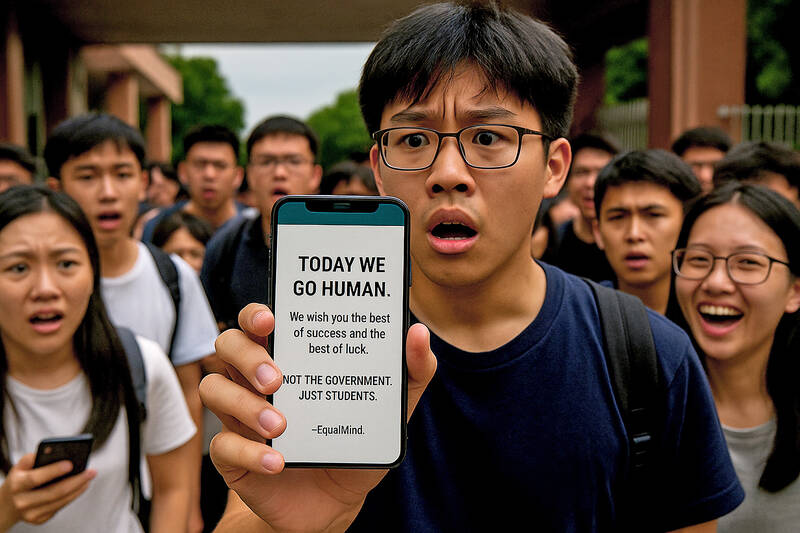 接著毫無預警地,他的螢幕上閃過一則訊息:「今天,靠自己。祝福考的全都會,矇的全都對!」接著又出現一行字:「不是政府搞的。而是出自學生之舉—EqualMind。」