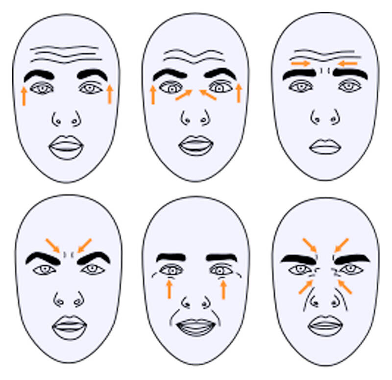 Anger: The eyebrows point downward in a V-shape, and vertical lines form between them. The mouth and jaw are tensed.