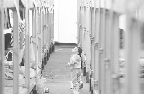 Mr Chan, whose home was destroyed in the 921 earthquake, sat with his young children, pushing away the rainwater accumulating on the canvas tent.