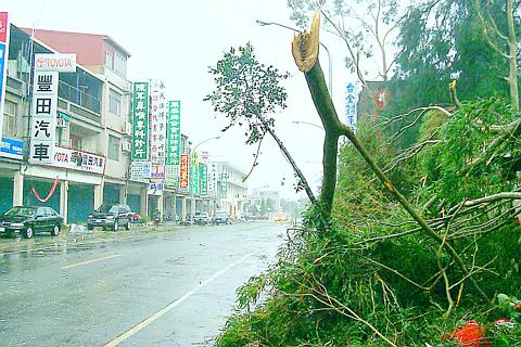 Gale-force winds also swept through historic Tainan city, toppling an already earthquake-damaged dike at the mouth of Luerhmen River (鹿耳門溪).