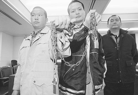 Four patients of Taipei's Lungfatang (龍發堂) psychiatric care hospital, who fled the facility, convened a press conference to accuse authorities at the facility of physical abuse.
