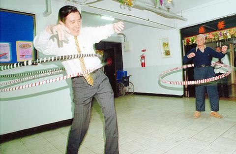 Wang kept twirling his hula-hoop in one of the lobbies, drawing a roomful of laughter. Taipei Mayor Ma Ying-jeou (馬英九) soon joined Wang to give the hula-hoop a try, drawing another round of laughter from the surrounding elderly, visiting officials and reporters.