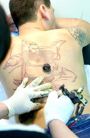 Charges at his shop vary a great deal, ranging between NT$1,000 and NT$60,000, depending on the size and complexity of the tattoo. While one simple icon may take about 20 minutes to finish, a tattoo covering one's back may take at least 10 hours or three trips, he said.