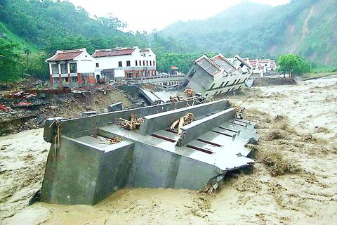 In Nantou's Chushan township (竹山鄉), residents of the low-lying lands around the Mingchu bridge (名竹大橋) had to wade barefoot through a muddy field after the bridge collapsed under the deluge.