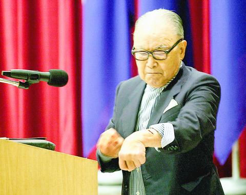 The octogenarian then slipped a blade out of his briefcase and slit his left wrist at the podium, saying, "Chairman Lien Chan (連戰) must unite the party and handle the proposal to expel Lee for the sake of justice."