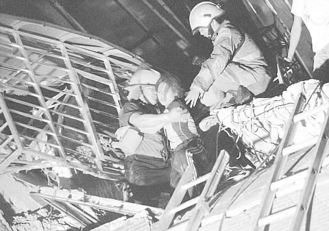 Meanwhile, the most serious building collapse in the Taipei County area -- a 12-story residential building, located on Mingan Road in Hsinchuang -- killed 13, including a pregnant woman, and injured around 160, police said. Police said that about 30 people remained trapped in the wreckage, as of 10pm yesterday.