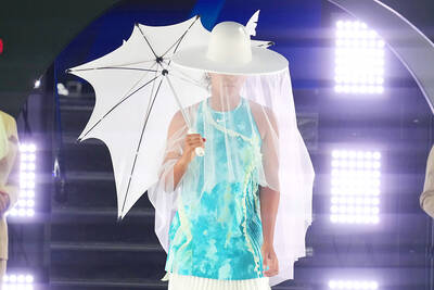 COURT FASHION: Naomi Osaka emerged for her match clutching a white parasol and wearing a wide-brimmed hat and veil, saying her outfit was modeled after ‘jellyfish’