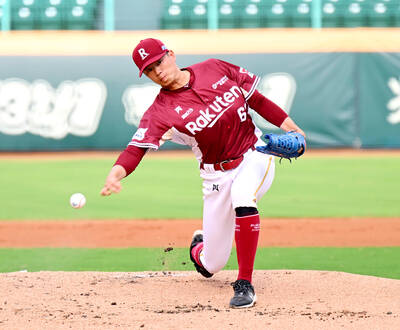 The Rakuten Monkeys’ Huang Tzu-peng pitches against the Uni-President Lions in Game 3 of the CPBL Playoffs at Chengcing Lake Baseball Stadium in Kaohsiung last night. Huang pitched five innings in the Monkeys’ 9-3 victory over the Lions, the pitcher’s first win as a starter since June. Taoyuan lead