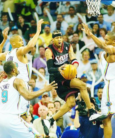 Five 76ers scored in double figures Monday to make up for Allen Iverson's series-lowest score of 22 as Philadelphia beat the New Orleans Hornets 96-87 to take a 3-1 lead in the playoff series.