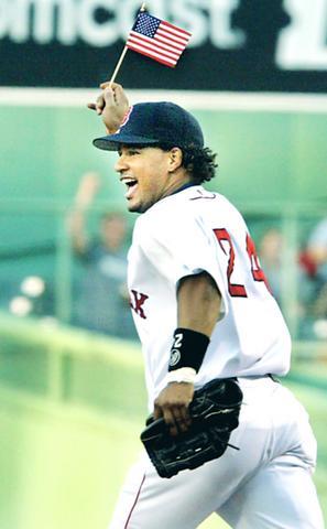 Manny Ramirez led his Red Sox teammates out of the dugout Tuesday, waving a small American flag on his first full day of US citizenship.