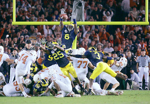 Dusty Mangum kicked a 37-yard field goal as time expired and No. 6 Texas, behind quarterback Vince Young, edged No. 13 Michigan 38-37 Saturday in the first matchup of two of US college football's elite programs.