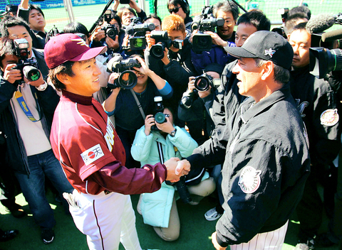 Rakuten manager Yasushi Tao shook hands with Lotte manager Bobby Valentine in a ceremony held before the game.