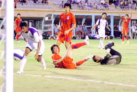 Ahn Jung-Huan made a meal of it, but the the ball somehow managed to find its way into the back of the net over the prone Taiwan goalkeeper, Lu Kun-chi (呂昆錡).