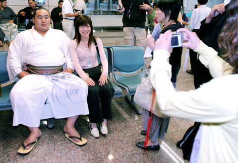 A 100-strong delegation of the Japan Sumo Association, including 42 top-ranked professional sumo wrestlers, arrived in Taiwan yesterday for a five-day visit.