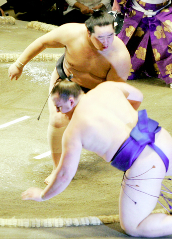 Sekiwake Kotomitsuki all but dashed Hakuho's chances of promotion to grand champion when he got hold of the ozeki's belt, spun him around and shoved him out to improve to 6-1.