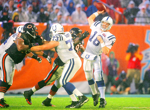 In an old-fashioned southern Florida soaker, the football squirted loose and bounced all over the waterlogged field. The rain resulted in eight turnovers, including two late interceptions thrown by Chicago's Rex Grossman that sealed the game for Indianapolis.