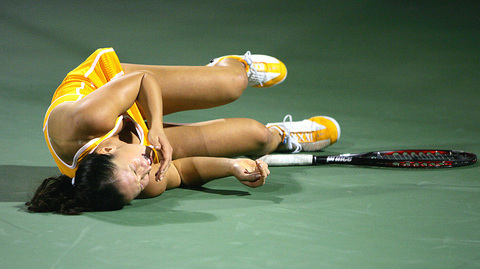 Only four points afterwards she stumbled badly while launching a backhand counter-drive, twisting her left ankle while trying to avoid a fall.