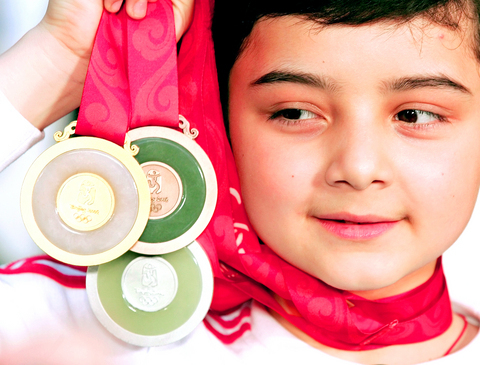 The medals were unveiled at a one-hour ceremony in the Capital Museum yesterday, w elcomed by folk music, rock music and a shower of gold confetti.