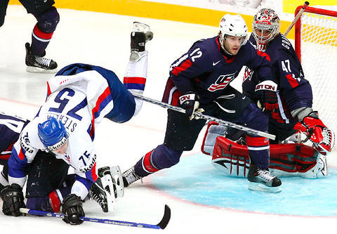 The US scored first at 8:17 when Andrew Hutchinson's slapshot from inside the blue line beat Slovakia goaltender Karol Krizan. Even a man down, the Americans went up 2-0 when David Backes stole the puck and skated down to backhand in high past Krizan at 12:27.
