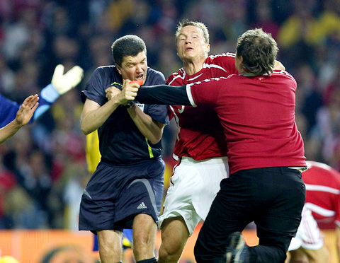 German referee Herbert Fandel had just awarded a penalty to Sweden and sent off Denmark's Christian Poulsen when a supporter ran on to the pitch and appeared to strike the official.