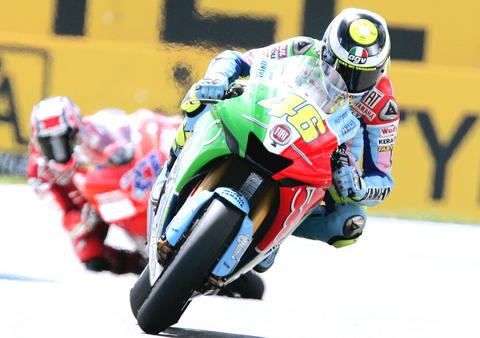 Rossi sat on the rear wheel of Stoner's Ducati for 12 laps before making his move with just over three to go. He cut inside Stoner going into the final chicane and powered away to lead by nearly a second on the next lap.
