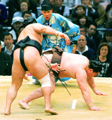 In other major bouts, ozeki Chiyotaikai swatted down Kotoshogiku to pick up his third win against one loss. Sekiwake Kotoshogiku fell to 1-3.