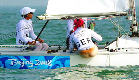 In the 15-boat women’s Yngling class, with crews of three, British favorites Sarah Ayton, Sarah Webb and Pippa Wilson finished the day in the lead overall, with a second and a third place.