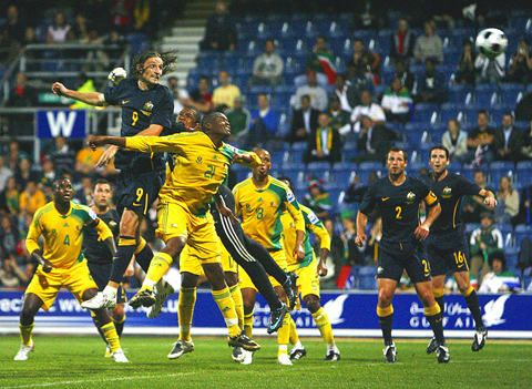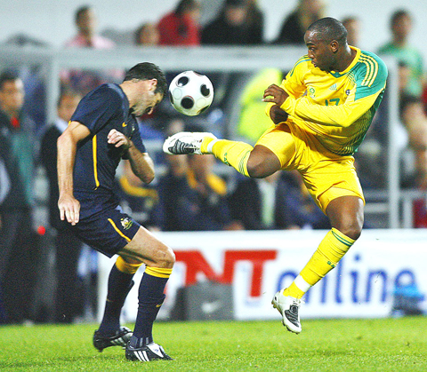 The first chance of the game fell to Australia on six minutes. South Africa’s Aaron Mokoena was shown a yellow card for a tug on Scott McDonald just outside the penalty box, but Aussie midfielder Vincenzo Grella missed the target following the resulting free-kick.