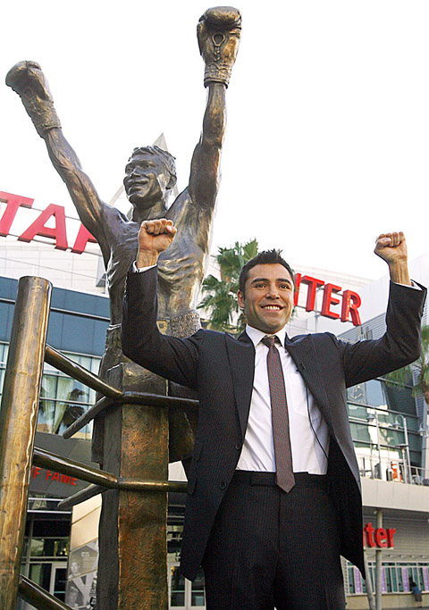 Oscar de la Hoya saw a statue of his likeness unveiled in front of Staples Center arena on Monday, while Manny Pacquiao kept a relatively low profile as both boxers prepared to head to Las Vegas for their “Dream Match” megafight on Saturday.