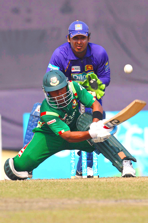 Bangladesh had an opportunity to clinch their maiden tri-series involving a Test-playing nation when left-arm spinner Shakib al-Hasan removed Sangakkara and Nuwan Kulasekara in three balls to reduce Sri Lanka to 114-8.