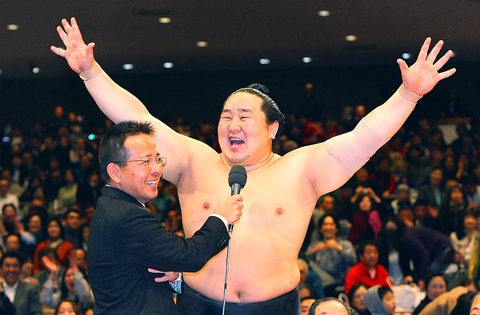 Asashoryu’s win made the front pages of yesterday’s Japanese newspapers, which carried pictures of him raising his arms in victory or fighting back tears.