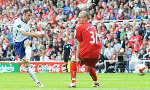 Giggs struck his fourth goal of the season before the break at the Riverside Stadium yesterday to help double United’s points advantage over title rivals Liverpool, who host Newcastle United today.