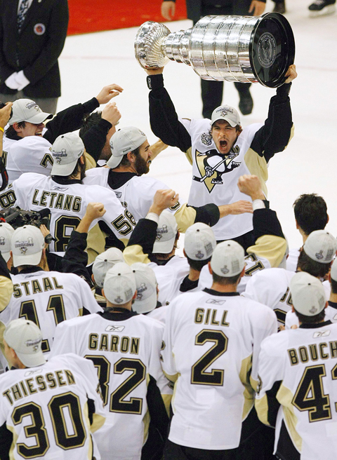 Captain Sidney Crosby accepted the Stanley Cup from NHL commissioner Gary Bettman and hoisted it high above his head while his teammates embraced each other and cheered.