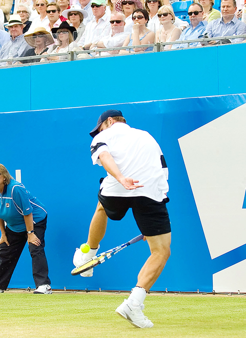 He even laughed when his effort failed to win him the point, but absentmindedly continued to walk towards the back of the court and sprained his ankle between the raised border of the grass surface and the concrete surrounding it.