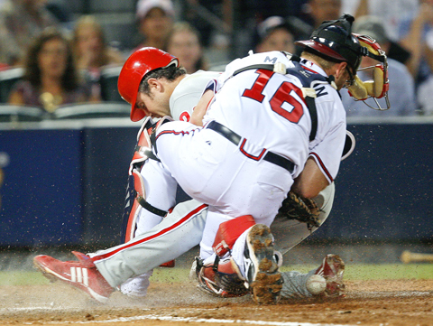 The Phillies tied the game on RBIs from Greg Dobbs and Pedro Feliz in the sixth but were shutdown late by Atlanta’s strong bullpen.