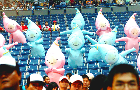 As usual with mascots, Gao Mei (高妹, literally “tall girl”) and Syong Ge (雄哥, “brave boy”) look as if they’ve been designed by a three-year-old on Ritalin. According to the marketing blurb Gao and Syong, whose names together form the name of the host city, are: “the shape of water droplets and translucent, the two water spirits personify Kaohsiung as a city of the sea and the sun.” Their halos absorb solar energy like the roof of the main stadium and “illuminate with a message of ecology and environmental protection.” Yeah, right.