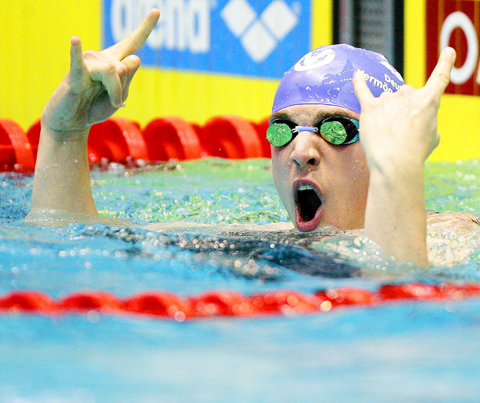 The 24-year-old Australian, who won two golds and a silver in Beijing’s Water Cube, clinched the 200m breastroke on Sunday in 2 minutes, 15.42 seconds, taking more than a second off the previous record.