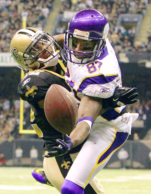 The Vikings drew first blood, but the teams went in 14-14 at halftime. The next two quarters followed the same pattern — the Saints scored and then the Vikings came back to level.