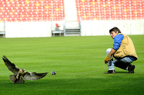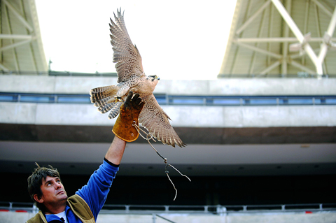 A hand-reared larger falcon is brought in to chase away crows, which pick on electrical wires and whose roosts can number about 100 birds. A would-be red wing starling residence has also been chased out of the stadium.