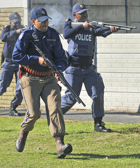 “They were warned that it’s an illegal gathering. They were given time to disperse and they didn’t. After several attempts, we used a stun grenade and rubber bullets to disperse the crowd,” police spokesman Andre Traut said. “A number of security guards were then arrested for illegal gathering.”