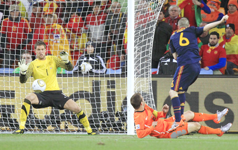 Villa had contributed five of the seven goals his side had scored en route to the final, but a superb block by Heitinga early in the second half denied him a sixth from his only clear chance in a final in which most of Spain’s best chances fell to their defenders.
